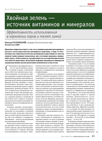 Скармливание крупному рогатому скоту еловой и сосновой хвои позволяет оптимизировать протекающие в организме жвачных животных метаболические процессы, повысить уровень антиоксидантной защиты, активизировать иммунную систему, предотвратить развитие гиповитаминозов, удовлетворить потребность в микроэл