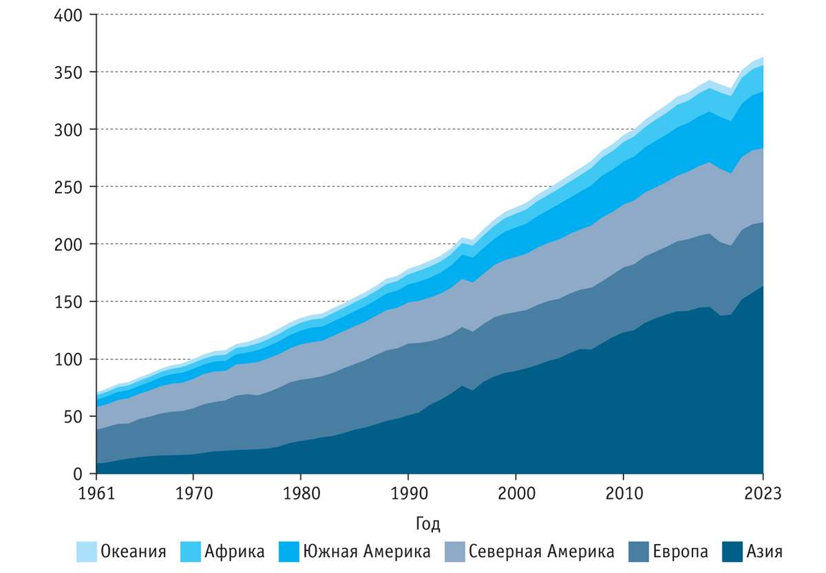 В последние десятилетия мировой мясной сектор устойчиво рос, и сегодня производство мяса превышает 360 млн т в убойной массе в год (рис. 1). Прогноз ФАО на период 2025–2034 гг. предполагает увеличение потребления мяса почти на 50 млн т в год к 2034 г. В этой динамике ключевую роль отводят рынкам Азии, Латинской Америки и Африки, где на фоне роста доходов и урбанизации баланс диеты продолжает смещаться в сторону белковой пищи. В совокупности это говорит о том, что потенциал роста мясного рынка остается значительным, но его структура по скорости роста и маржинальности становится все более разрозненной и неоднородной.