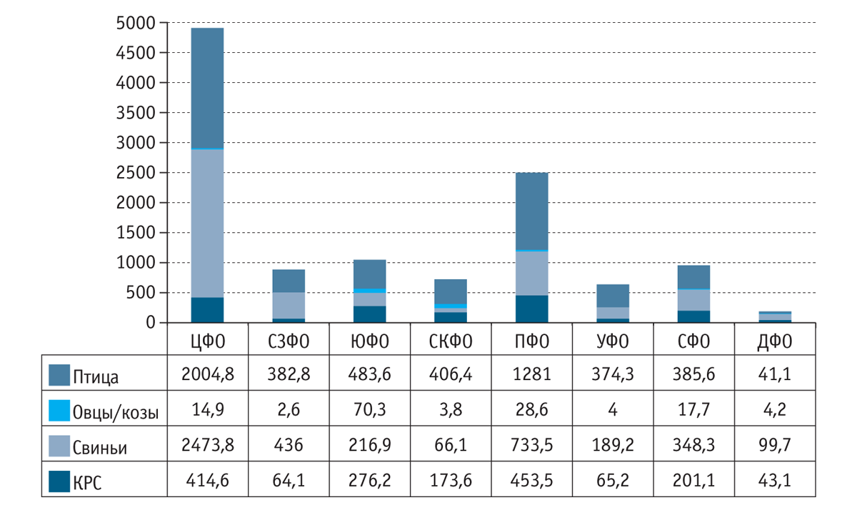 За девять месяцев текущего года, по данным Росстата, производство мяса увеличилось на 0,3% в живой массе по отношению к аналогичному периоду прошлого года. Отмечен прирост производства только птицы на убой (на 2,5%), а производство крупного рогатого скота, овец и коз значительно снизилось (на 4,3 и 3,5% соответственно). Наблюдается небольшое сокращение производства свиней на убой (на 0,2%), что обусловлено завершением инвестиционного цикла, а также потерями на приграничных территориях (рис. 4, 5).