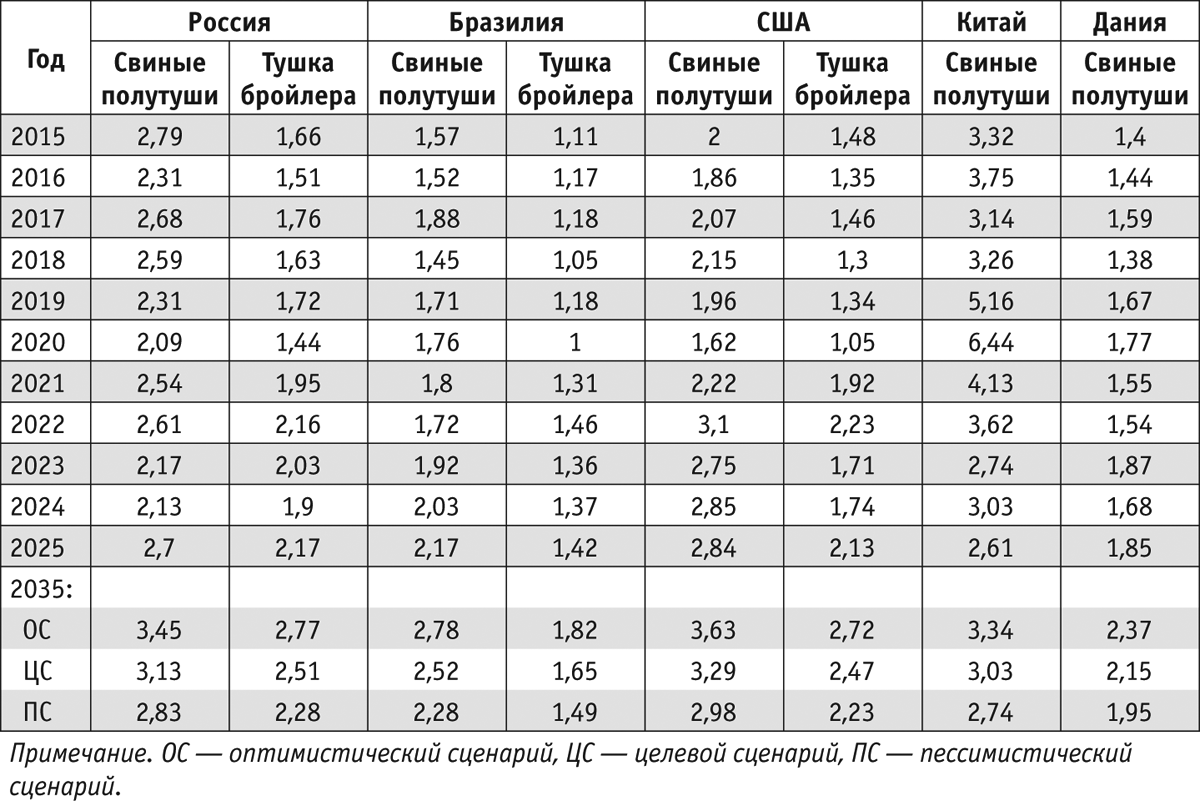 При оптимистическом сценарии (ежегодный рост цен на мясо на 2,5%, минимальные вспышки АЧС и гриппа птиц, снижение удельных затрат на 1%) рентабельность свиноводства и птицеводства может увеличиться примерно на 25–28%. Это будет отражать эффект технологического обновления, повышения производительности и оптимизации цепочек поставок. Российские показатели в этом сценарии приближаются к показателям ведущих экспортеров.