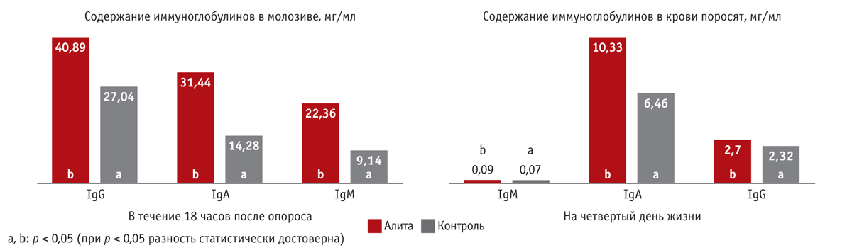 Одно из исследований, проведенное на предприятии(Испания, 2022) с поголовьем 2500свиноматок, позволило оценить влияние иммуномодулятора Алита на качество молозива. Добавку вводили в корм для свиноматок с 85-годня супоросности по 21-йдень лактации. Для оценки эффективности иммуномодулятора провели лабораторные исследования, направленные на определение содержания иммуноглобулинов в молозиве в течение 18часов после опороса и в крови поросят на четвертыйдень жизни(рис.1). Данные были проанализированы с помощью функции Fit Model в JMP16. Различия считались значимыми при P<0,05.