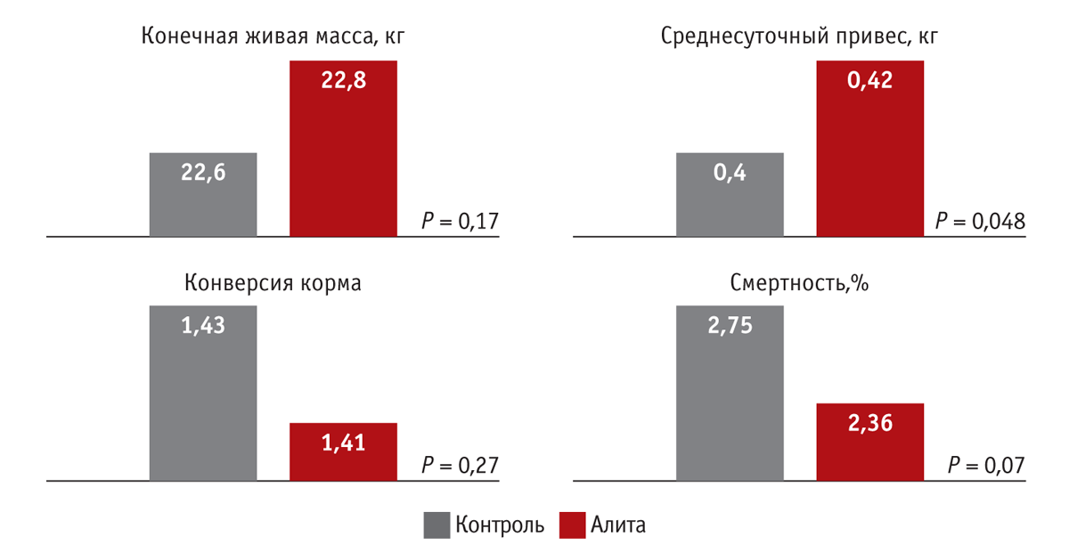 Следующий опыт(США, 2020) продемонстрировал эффективность введения иммуномодулятора Алита в корм для поросят в период с6-го по42-йдень жизни. Результаты представлены на рисунке2.