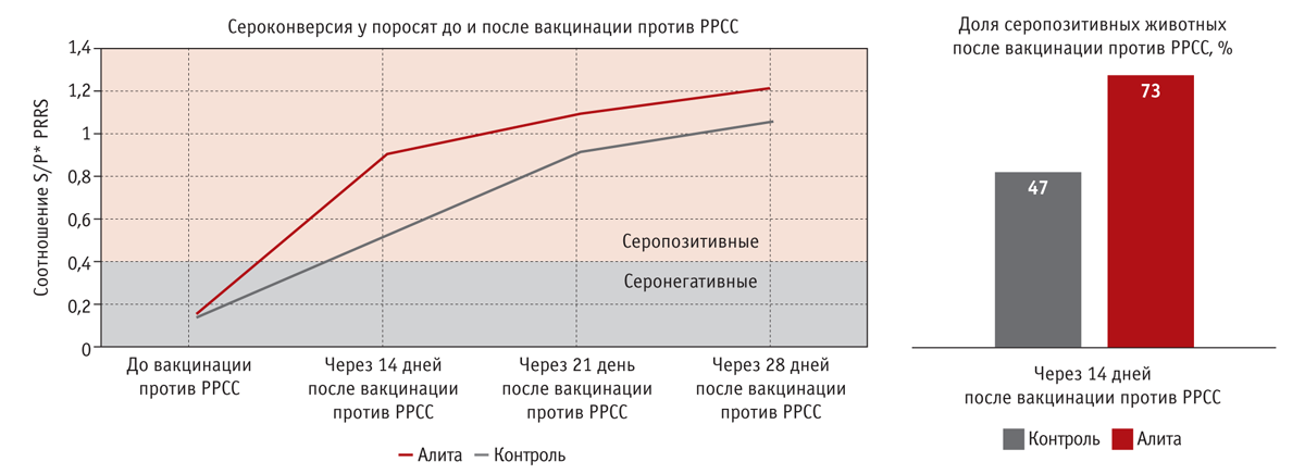 По результатам применения иммуномодулятора Алита отмечено повышение эффективности вакцинации против РРСС: более быстрое формирование сероконверсии уже на 14-йдень после введения вакцины и более однородная сероконверсия, что обеспечивает поголовью лучшую защиту от РРСС.
