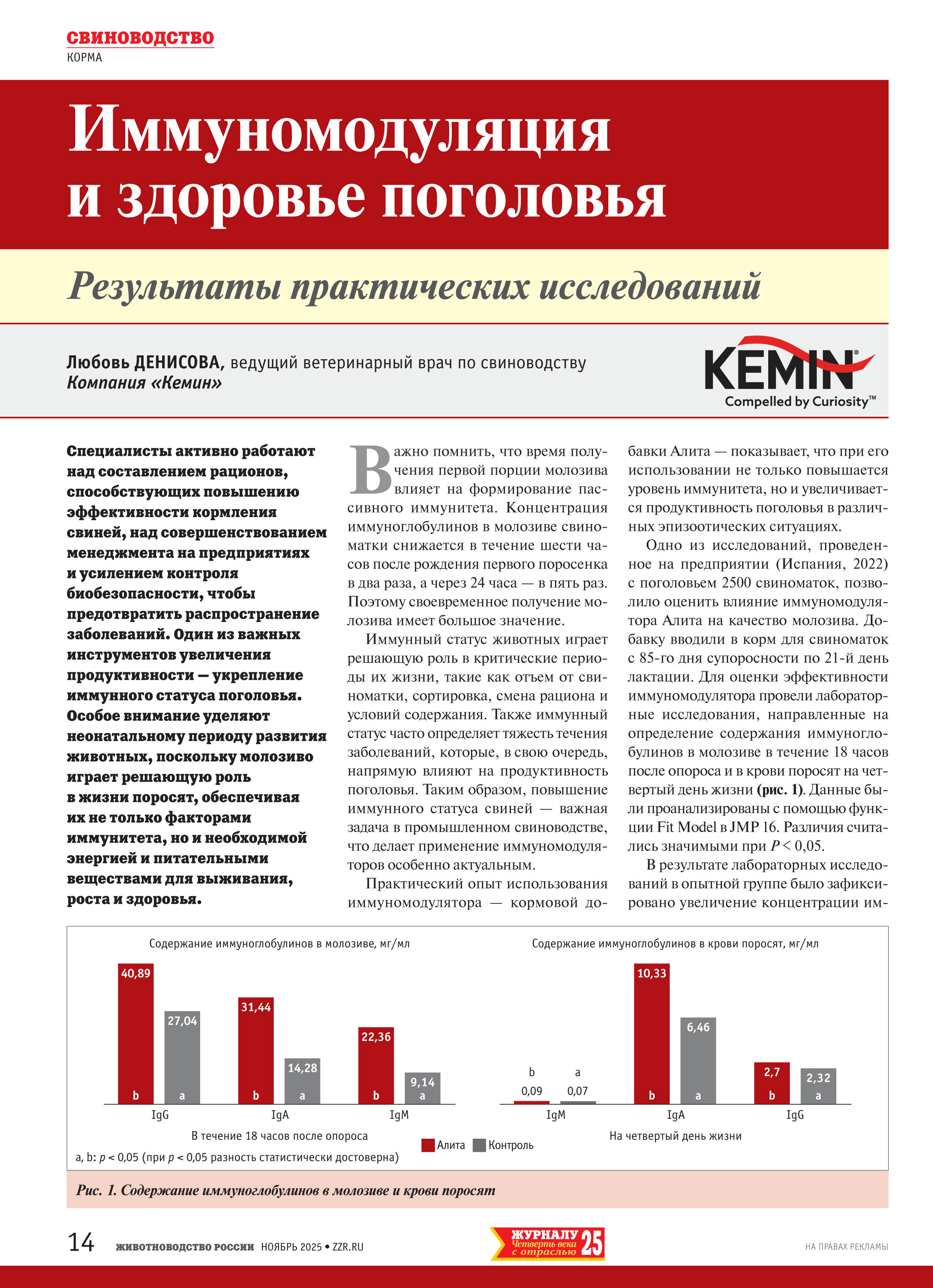 В ходе практических испытаний применение иммуномодулятора Алита от компании «Кемин» продемонстрировало свою эффективность в повышении продуктивности и иммунного статуса поголовья в различных эпизоотических ситуациях.