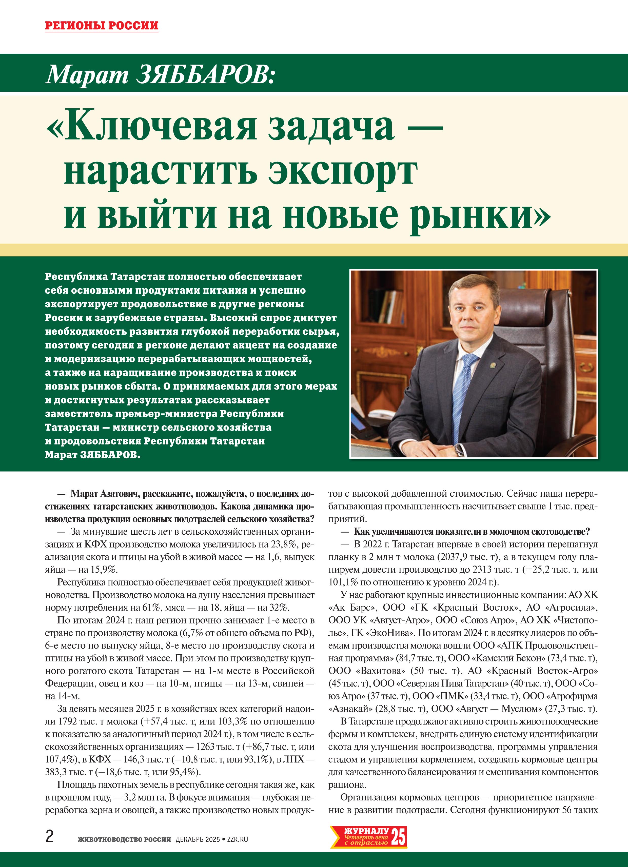 Республика Татарстан полностью обеспечивает себя основными продуктами питания и успешно экспортирует продовольствие в другие регионы России и зарубежные страны. Высокий спрос диктует необходимость развития глубокой переработки сырья, поэтому сегодня в регионе делают акцент на создание и модернизацию перерабатывающих мощностей, а также на наращивание производства и поиск новых рынков сбыта. О принимаемых для этого мерах и достигнутых результатах рассказывает заместитель премьер-министра Республики Татарстан — министр сельского хозяйства и продовольствия Республики Татарстан Марат ЗЯББАРОВ.