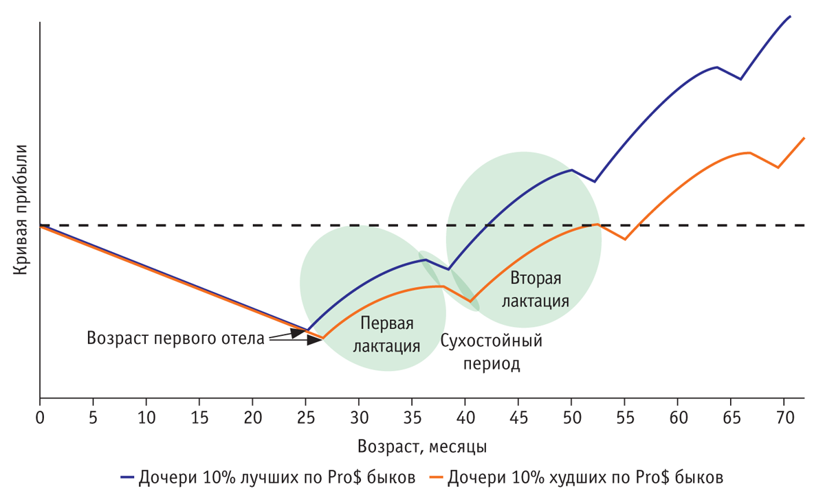 На протяжении сухостойного периода предприятие не получает выручки, но продолжает расходовать средства на содержание и кормление коров, что, конечно же, влияет на общую прибыльность. Только во вторую лактацию (с момента рождения до достижения возраста 42 месяцев) окупаются расходы на содержание дочерей 10% лучших по Pro$ быков (на рис. 1 этот показатель обозначен пунктирной линией). Дочери 10% худших по Pro$ быков-производителей не достигали точки безубыточности в среднем до 52 месяцев (до конца их второй лактации). В обоих случаях прибыль увеличивалась по мере того, как животные проходили следующие лактации, но прибыльность дочерей лучших по Pro$ производителей всегда была выше.