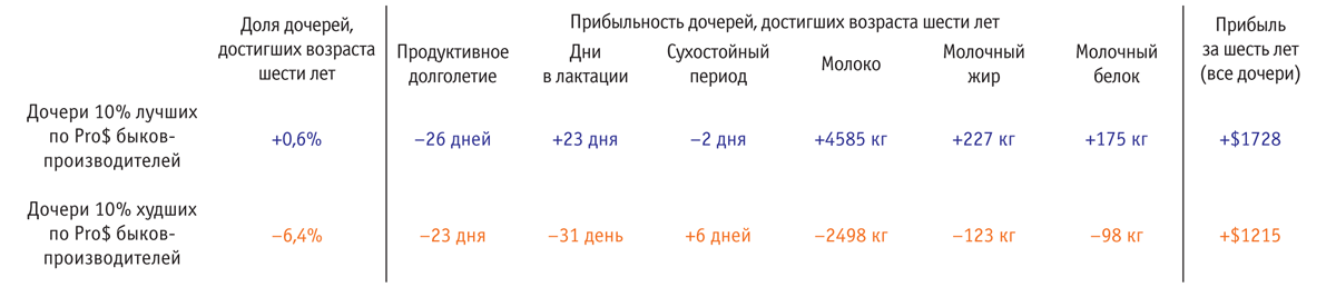 Производителей ранжировали по лучшим и худшим 10% быков по индексу Pro$. Средние значения индекса Pro$ для быков этих двух групп составили соответственно +$ 1505 и –$ 1534. Первоначальные различия заключались в возрасте первого отела: дочери 10% лучших по Pro$ быков отелились в 25 месяцев, а дочери 10% худших по Pro$ быков — практически в 27 месяцев. При такой задержке увеличиваются затраты на выращивание телок и смещаются сроки начала получения дохода.