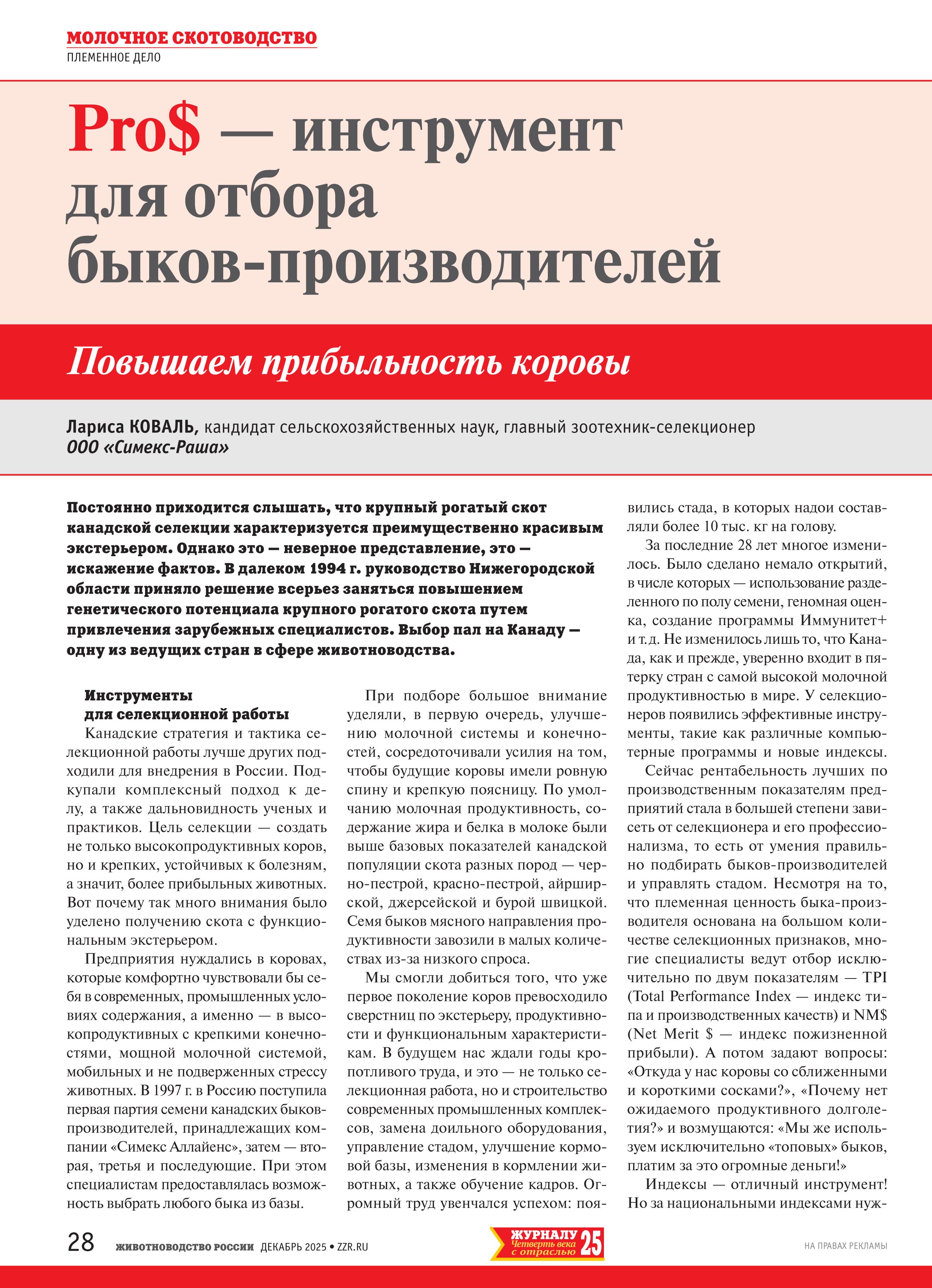 Такой подход способствует улучшению функциональных характеристик, экстерьера и продуктивности коров, что в конечном итоге приводит к увеличению прибыли. В Канаде для ранжирования быков используют индексы LPI (производительность в течение жизни) и PRO$ (реальная прибыльность) — аналоги американских индексов TPI и NM$. Индекс PRO$ начали применять в 2015 г., а в 2025 г. отметили своеобразный юбилей — десять лет! Что же это за показатель?