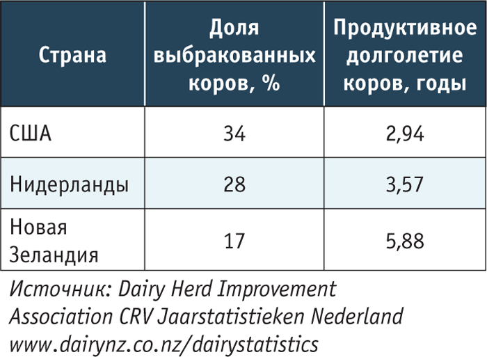 Показатели ежегодной выбраковки и продолжительности хозяйственного использования коров в странах с развитым молочным скотоводством представлены в таблице.