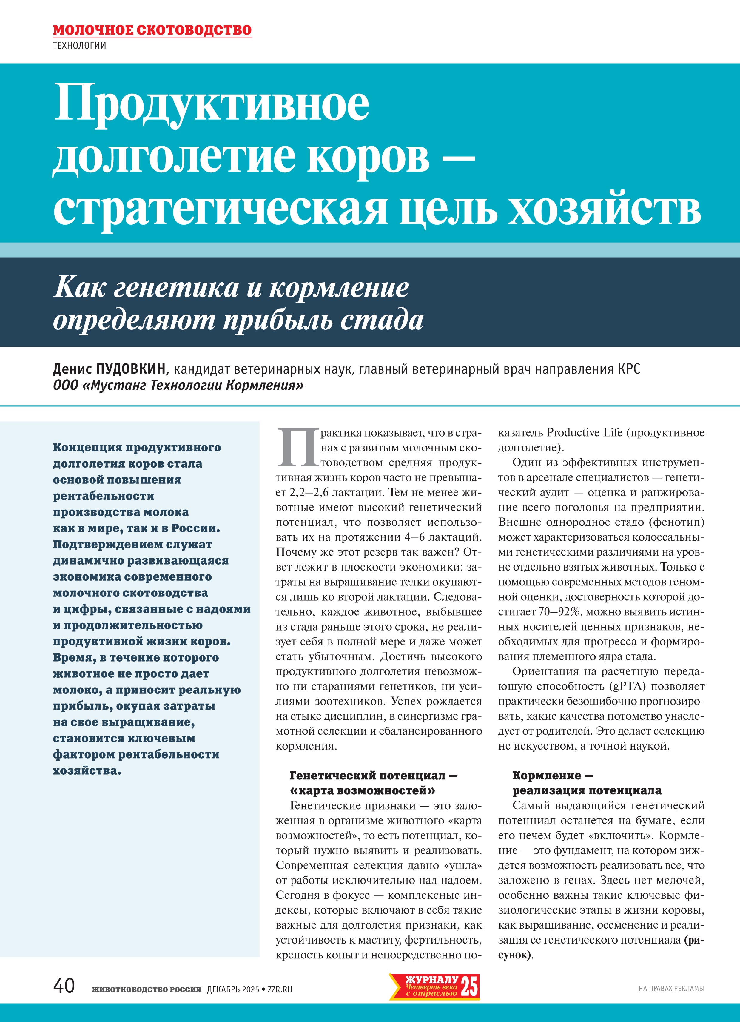 Продуктивное долголетие — закономерность и результат целенаправленной комплексной работы специалистов. Это — синергия «трех китов» — точной генетической селекции, выверенной до мелочей системы кормления и разумной экономической стратегии управления стадом. Вкладывая средства в генетический аудит, качественные корма и создание комфортных условий для животных, хозяйство инвестирует в собственную устойчивую прибыльную перспективу. В конце концов наличие долгоживущих коров — это не только характеристика благополучия стада, но и главный фактор рентабельности предприятия.