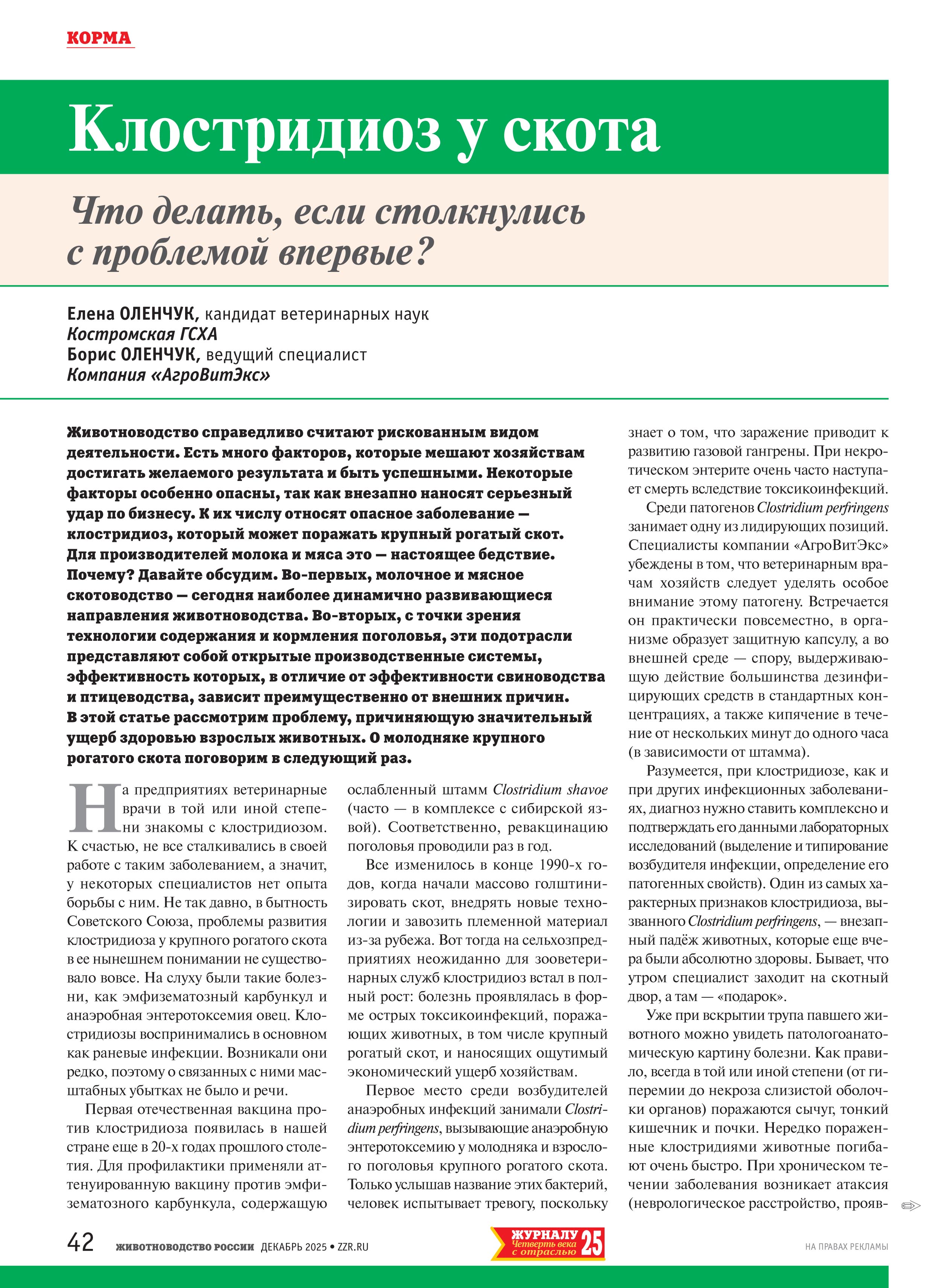 На предприятиях ветеринарные врачи в той или иной степени знакомы с клостридиозом. К счастью, не все сталкивались в своей работе с таким заболеванием, а значит, у некоторых специалистов нет опыта борьбы с ним. Не так давно, в бытность Советского Союза, проблемы развития клостридиоза у крупного рогатого скота в ее нынешнем понимании не существовало вовсе. На слуху были такие болезни, как эмфизематозный карбункул и анаэробная энтеротоксемия овец. Клостридиозы воспринимались в основном как раневые инфекции. Возникали они редко, поэтому о связанных с ними масштабных убытках не было и речи.