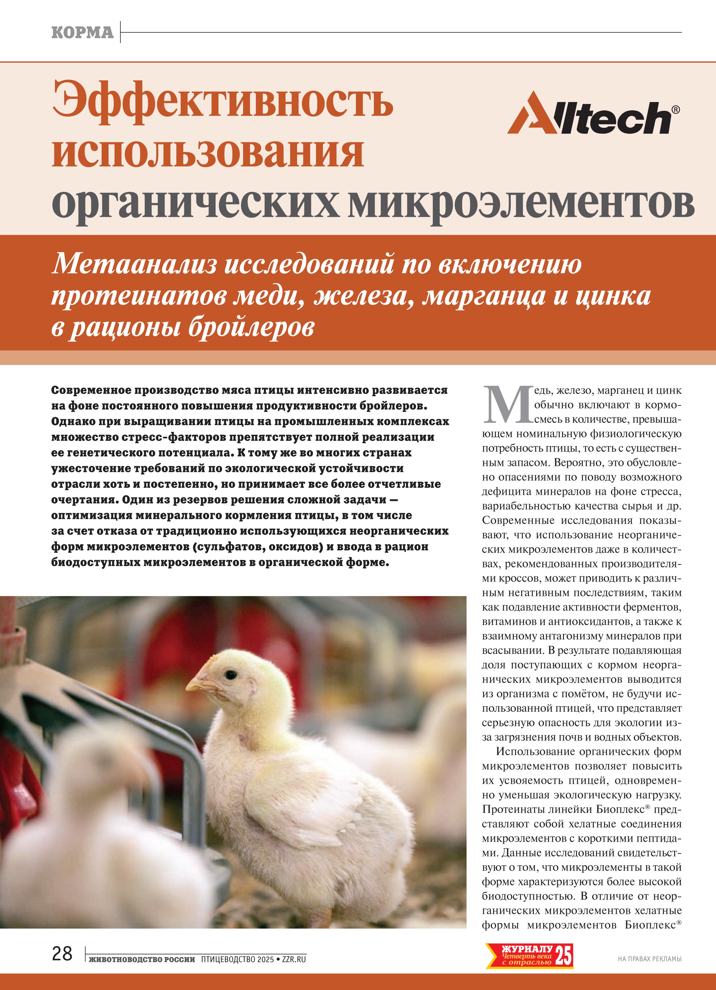 Современное производство мяса птицы интенсивно развивается на фоне постоянного повышения продуктивности бройлеров. Однако при выращивании птицы на промышленных комплексах множество стресс-факторов препятствует полной реализации ее генетического потенциала. К тому же во многих странах ужесточение требований по экологической устойчивости отрасли хоть и постепенно, но принимает все более отчетливые очертания. Один из резервов решения сложной задачи — оптимизация минерального кормления птицы, в том числе за счет отказа от традиционно использующихся неорганических форм микроэлементов (сульфатов, оксидов) и ввода в рацион биодоступных микроэлементов в органической форме.