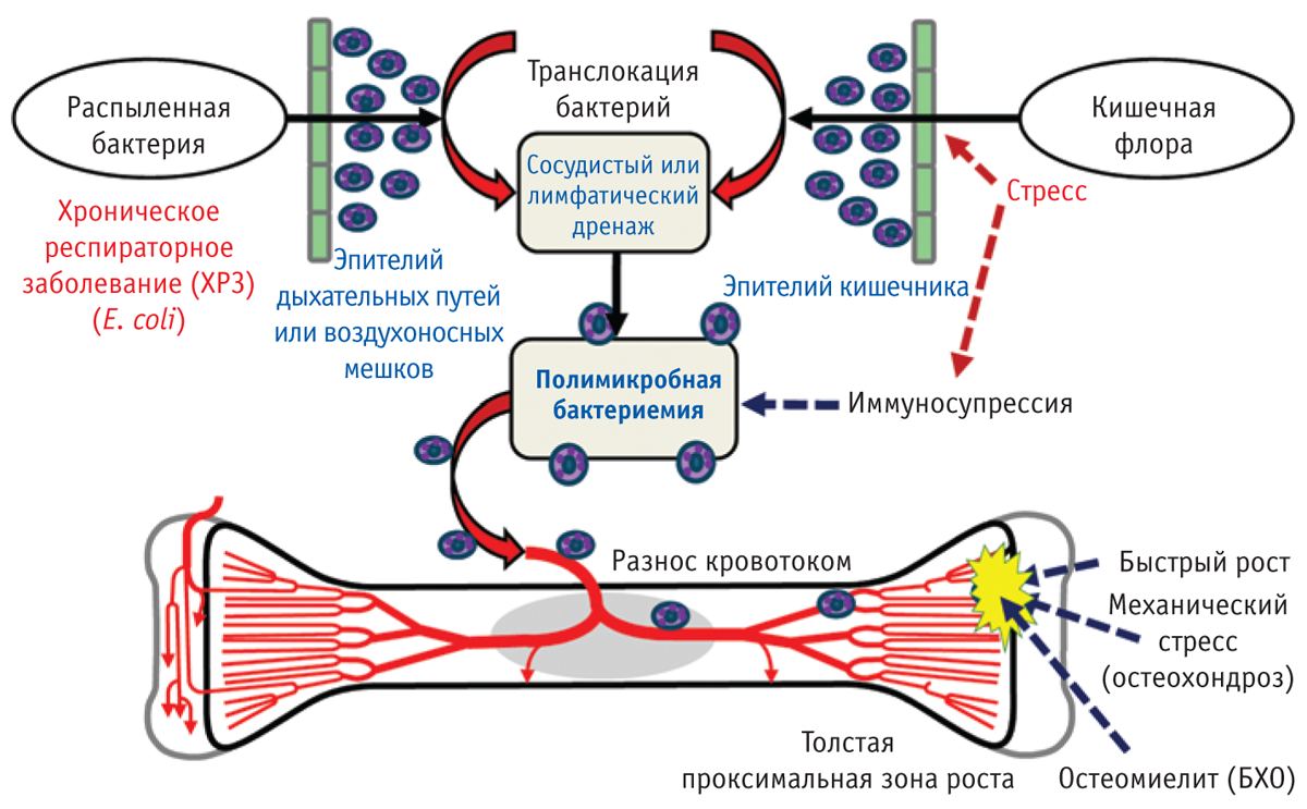 Под воздействием стресса увеличивается проницаемость кишечника. Белки, связывающие энтероциты (клаудин и окклюдин), разрушаются, и бактерии из желудочно-кишечного тракта попадают в кровеносную систему. Происходит их транслокация в костную ткань, которая находится далеко от зоны действия иммунных клеток и антибиотиков. Таким же путем бактерии перемещаются в костную систему из респираторного тракта. Микротрещины, возникающие между белым хрящом и ростовой пластиной, когда птица активно набирает вес, становятся идеальным местом для развития бактерий. Таким образом, для возникновения БХО должно совпасть два фактора: бактериальная транслокация под воздействием стресса и механический стресс, приводящий к микротравмам в проксимальном участке костей (рис. 1).