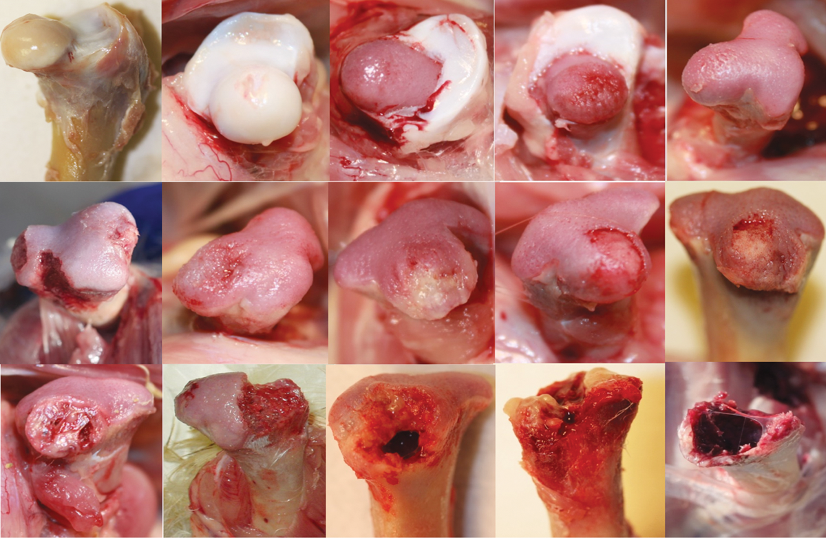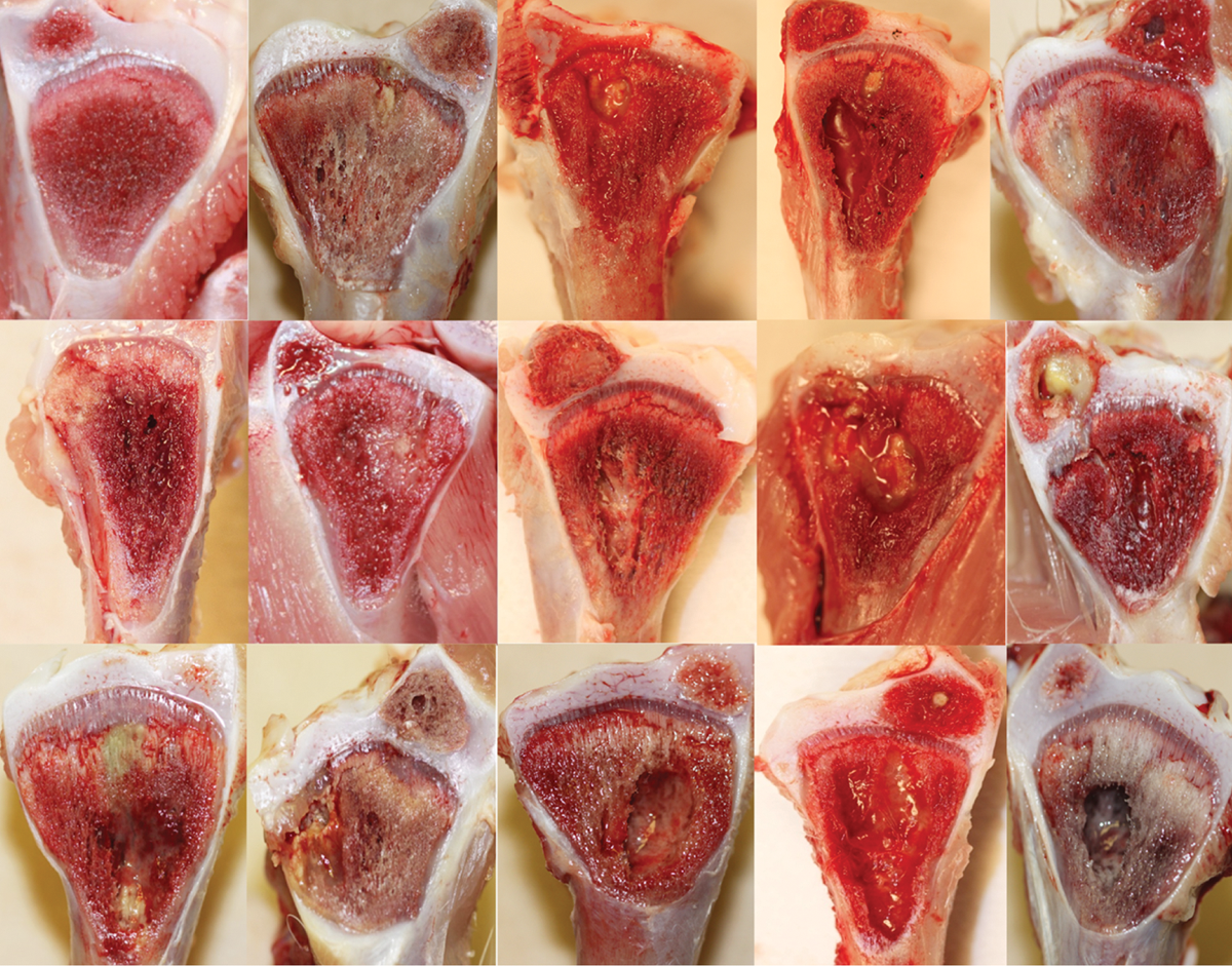 На рисунке 2 показано, что мы можем увидеть в такой ситуации в убойном цехе. В верхнем ряду — анатомическая норма, в среднем — средняя степень повреждения, в нижнем — тяжелая, когда происходит разрушение головки бедренной кости. Если отправить такие образцы в лабораторию, с 99%-й вероятностью будут выявлены бактерии, присутствующие в желудочно-кишечном или респираторном тракте птицы.