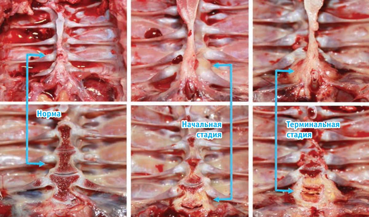 По рисунку 3 можно таким же образом оценить патологию берцовой кости. По очагам воспаления в среднем и нижнем ряду легко понять, как быстро бактерии разрушают костную ткань. На рисунке 4 представлены случаи поражения позвоночника Т4. При возникновении очагов воспаления, как в среднем и верхнем рядах, птица испытывает сильную нагрузку, сдавливается спиной мозг, нарушается проводимость и развивается частичный или полный паралич. Часто из-за сильной боли птица сидит на хвостовой части, на скакательных суставах регистрируют ожоги из-за постоянного контакта с подстилкой.