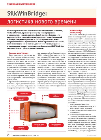 Компания SilkWinBridge специализируется на экспедировании жидких и насыпных грузов с 2014 г. и несколько лет подряд не выходила из топа трансконтейнерных перевозчиков Омска. Она берется за срочные перевозки, транспортировку негабаритных и сложных грузов, требующих специальных условий, формирует сборные агропоезда. SilkWinBridge впервые внедрила автотранспортные средства, трехосные и четырехосные вагоны в логистические схемы, первой начала автоперевозки в Краснодарском крае. Конечно, не осталась в стороне, когда рынок стали покорять флекситанки — новое слово в контейнерных перевозках наливных и насыпных грузов, в том числе растительных масел, жидкого пищевого яйца, вин, а также зерна, жмыхов и удобрений.