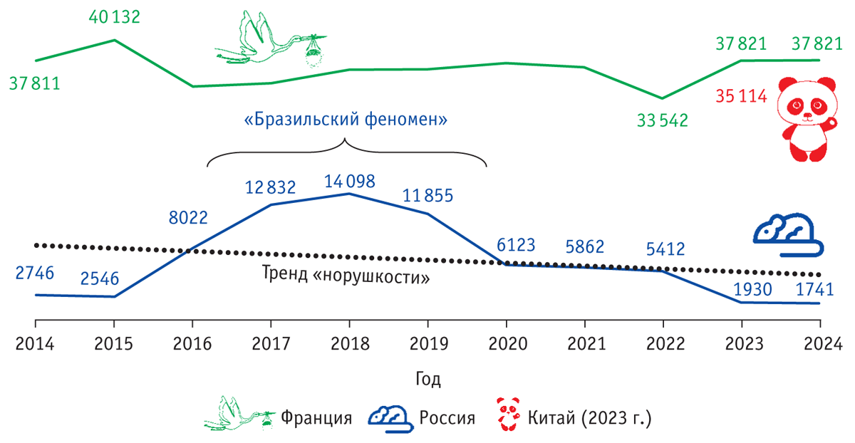 В итоге «мышь» отечественной ТЭ через пять лет после отъезда бразильских эмбриологов из России «приземлилась» окончательно (см. рис. 1). Тренд «норушкости» не ослабел и в 2024 г.: остается только гадать, сколько лет пройдет, прежде чем российская «норушка» юркнет в норку нулевой статистики.