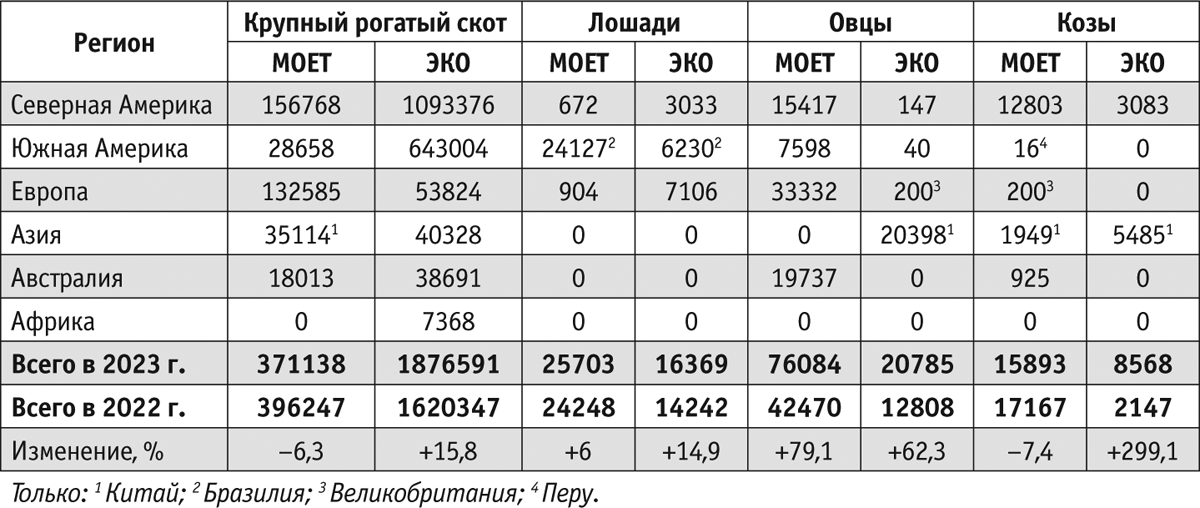 В 2023 г. увеличилось число собранных ЭКО-эмбрионов всех видов животных: крупного рогатого скота — на 16%, овец — на 62, лошадей — на 15, коз — на 300%! Весьма вероятно, что тенденция перехода на «пробирочные» технологии ЭКО (+16% к уровню прошлого года) сохранится в ближайшие несколько лет. Но не все так однозначно в отношении «пробирочной» ТЭ: одновременно за год выросли показатели сбора эмбрионов овец и лошадей по технологии МОЕТ: на 79 и 6% соответственно.
