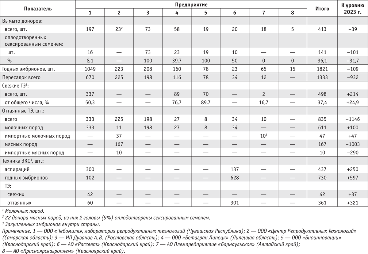 Почти по всем позициям эмбриосбора МОЕТ в 2024 г. зафиксированы отрицательные показатели по сравнению с данными 2023 г. (см. табл. 2), за исключением увеличения в два раза числа пересадок свежеполученных зародышей (498 против 284 штук). В этом отличились эмбриологи ООО «Чебомилк», ООО «Бетагран Липецк» и ООО «Биоинновации», которые более половины зародышей сумели пересадить без криоконсервации, тем самым обеспечив повышение показателя стельности среди реципиентов на 5–10%.