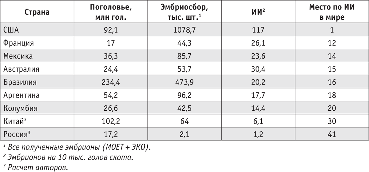 Тем не менее в мировом рейтинге (IETS) Россия находится в десятке последних: в нем даже Франция — первый номер европейской ТЭ — по индексу интенсивности (ИИ) применения эмбриотрансфера в 2023 г. занимала лишь 12-е место (ИИ = 26,1). ИИ использования ТЭ для каждой страны рассчитывают исходя из производства всех эмбрионов (МОЕТ + ЭКО) на 10 тыс. голов скота (табл. 3).