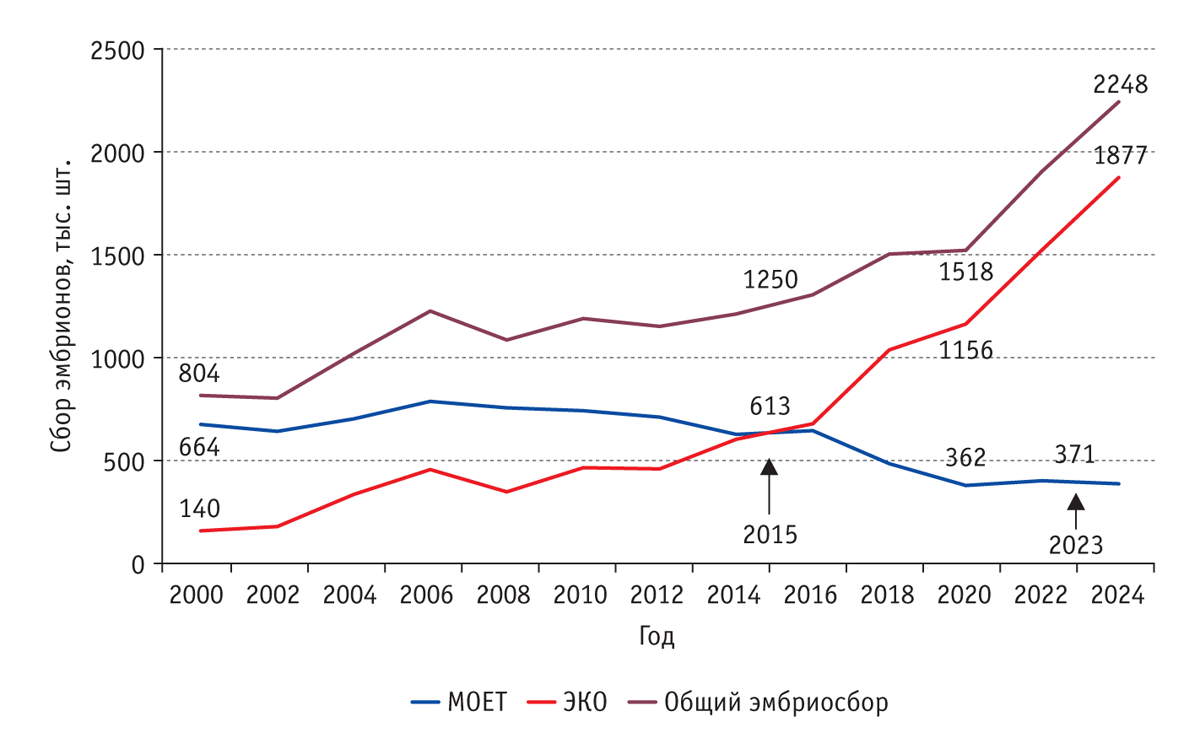 Мировое производство бластоцист-ЭКО (без боенских) увеличивалось с 2000 г. (со 140 тыс. штук) нарастающими темпами, догнало в 2015 г. производство зародышей МОЕТ (613 и 660 тыс. штук соответственно) и ушло в отрыв, достигнув в 2023 г. 1876,6 тыс. против 371,1 тыс. эмбрионов МОЕТ.