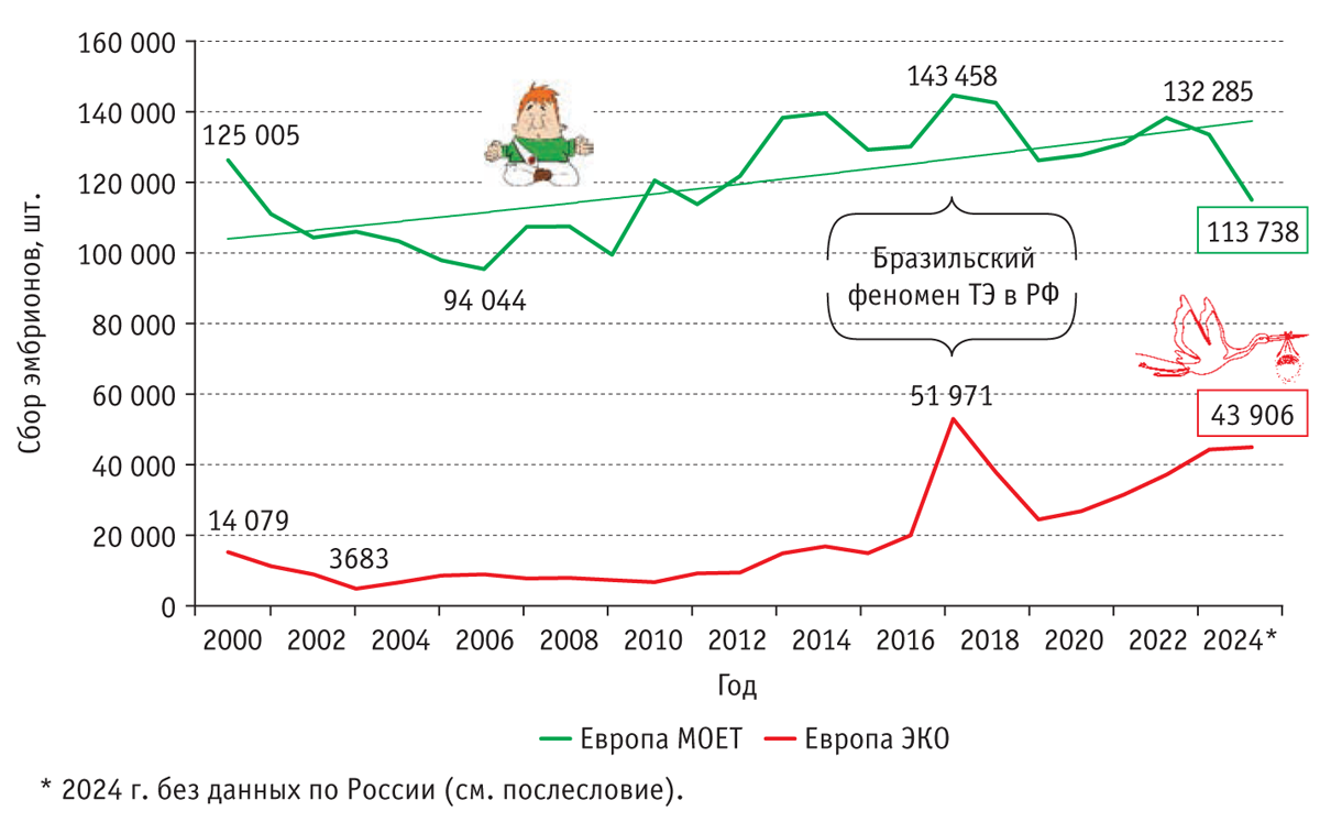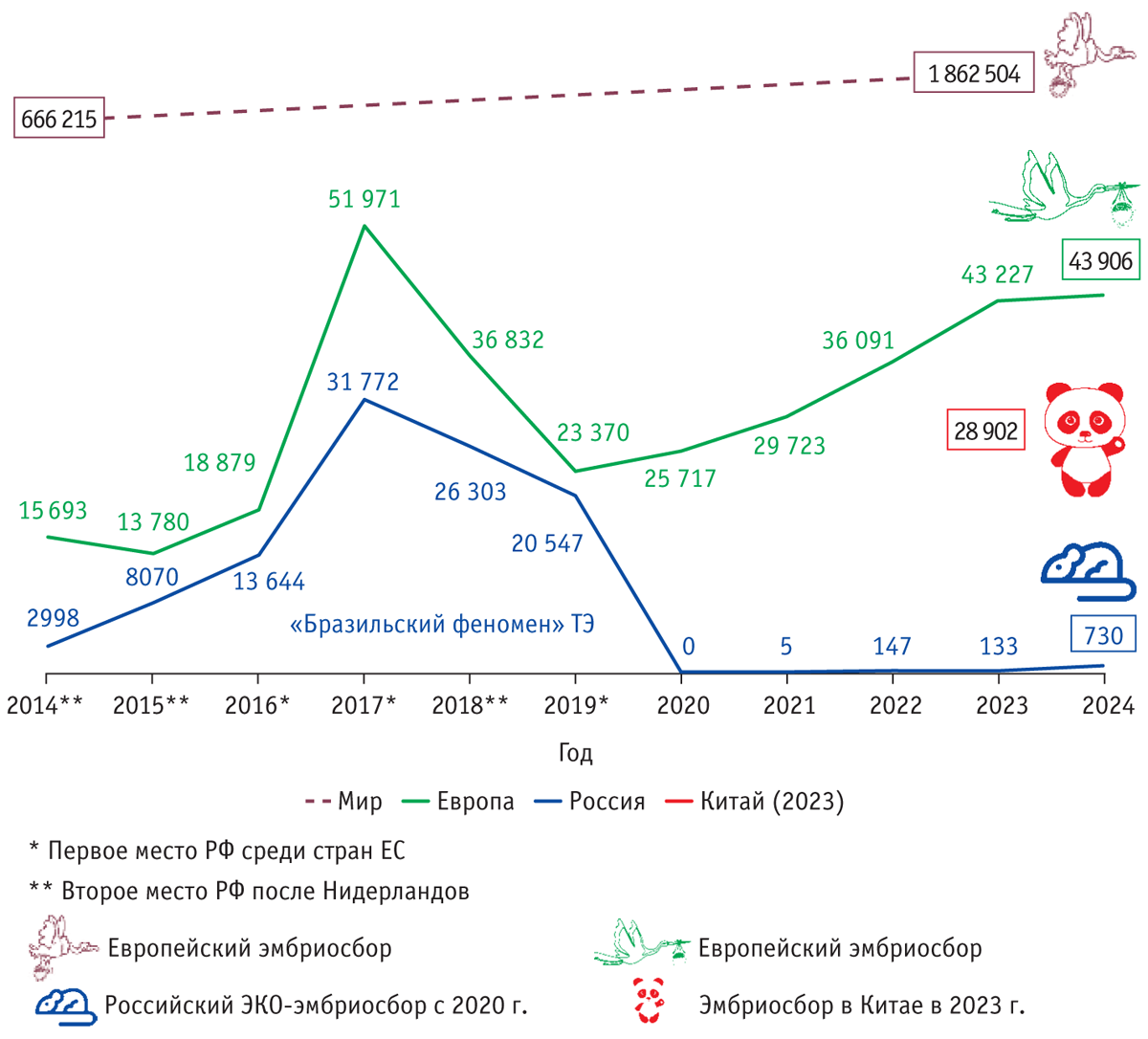 На рисунке 3 хорошо видно, что после 2019 г. пути европейской эмбриологии-ЭКО и российской «пробирки» разошлись как в море корабли. В верхней части рисунка отмечено мировое производство эмбрионов-ЭКО, достигшее в 2023 г. 1,9 млн штук (в 2022 г. — 1,5 млн штук). На таких высотах «летают» мировые лидеры ЭКО-ТЭ — США и Бразилия (свыше 968 и 473 тыс. бластоцист соответственно). Их показатели более чем на порядок выше уровня «полета» европейского «аиста» (44 тыс. штук), как у грифа Рюппеля, который способен подниматься на 11 тыс. км. С такой высоты «мышонка» российской ТЭ 2023 г. (133 эмбриона) и не разглядеть, а значит, и во внимание можно не принимать.