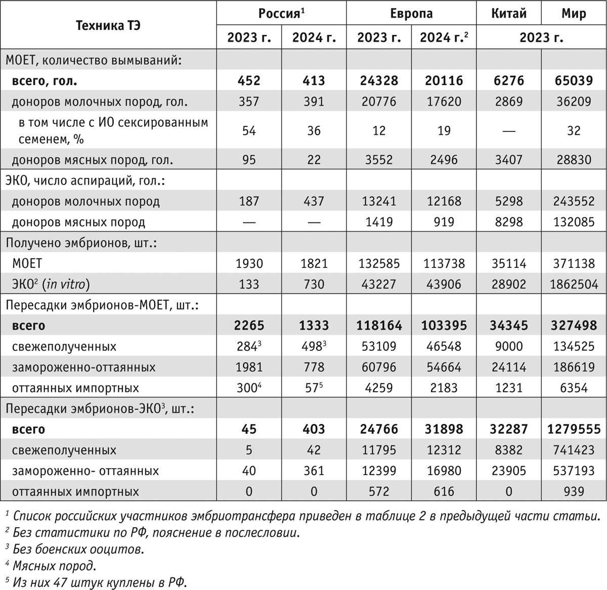 Еще, на наш взгляд, важно учитывать, что не все европейцы «помешаны» на ТЭ как на бизнес-проекте. Для мелкоземельных «помещиков» важна «уютная», относительно простая и менее хлопотная ТЭ (часто в виде хобби), пусть и с недобором био-телят. Да и в США МОЕТ до сих пор остается прерогативой некрупных «ковбойских» ферм и ранчо, реализующих стратегию не только производства молока и мяса, но и продвижения племенной работы в своем «карманном» стаде. А статистика традиционного сбора эмбрионов в США в 2024 г. (84 тыс. штук) ненамного отличается от общеевропейского объема при использовании МОЕТ (114 тыс. штук). К тому же, по данным АЕТЕ на 2024 г., из 96 сертифицированных команд эмбриологов в США 84 (87,5%) все еще производят эмбрионы МОЕТ в паре с ЭКО (американские парочки-ТЭ типа Twix: 2 в 1).