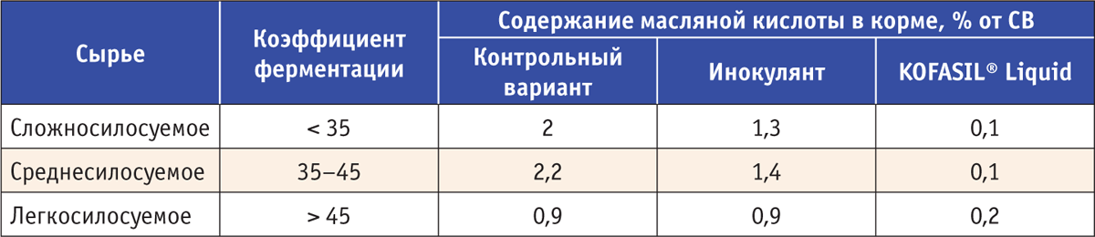 При прогнозируемом коэффициенте ниже 35, высоком уровне контаминации сырья клостридиями, его аэробной нестабильности и риске развития вторичной ферментации (особенно тогда, когда содержание СВ в растениях превышает 45%, а масса была недостаточно уплотнена в процессе трамбовки) рекомендовано применять химические консерванты.