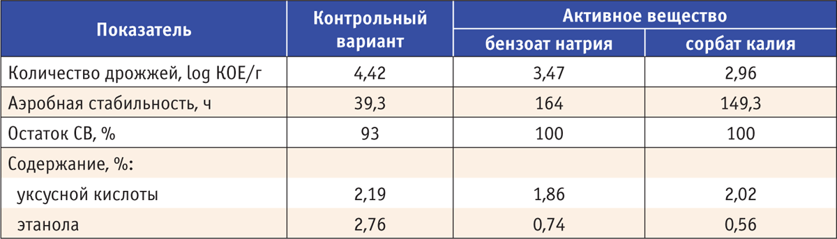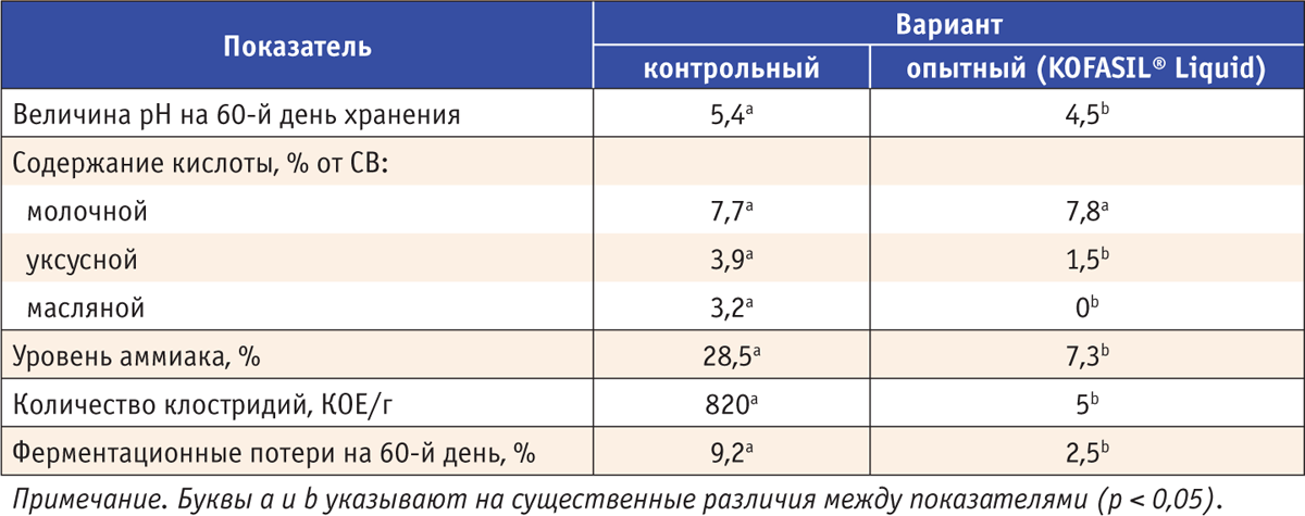 KOFASIL® Stabil эффективен при заготовке всех типов кормов: его используют для обработки как всей массы, так и верхнего слоя силоса (верхней трети). Активные вещества, входящие в состав добавки KOFASIL® Stabil, — хорошо известные пищевые консерванты — бензоат натрия и сорбат калия. Они активны в отношении дрожжей и плесневых грибов, а значит, положительно влияют на аэробную стабильность и другие параметры ферментации (табл. 4). Важно, что KOFASIL® Stabil не вызывает коррозии металла, не раздражает кожу и не представляет опасности для здоровья персонала.