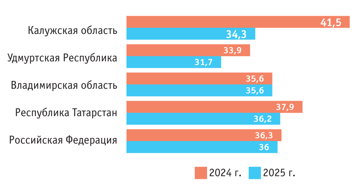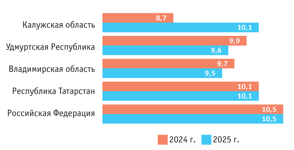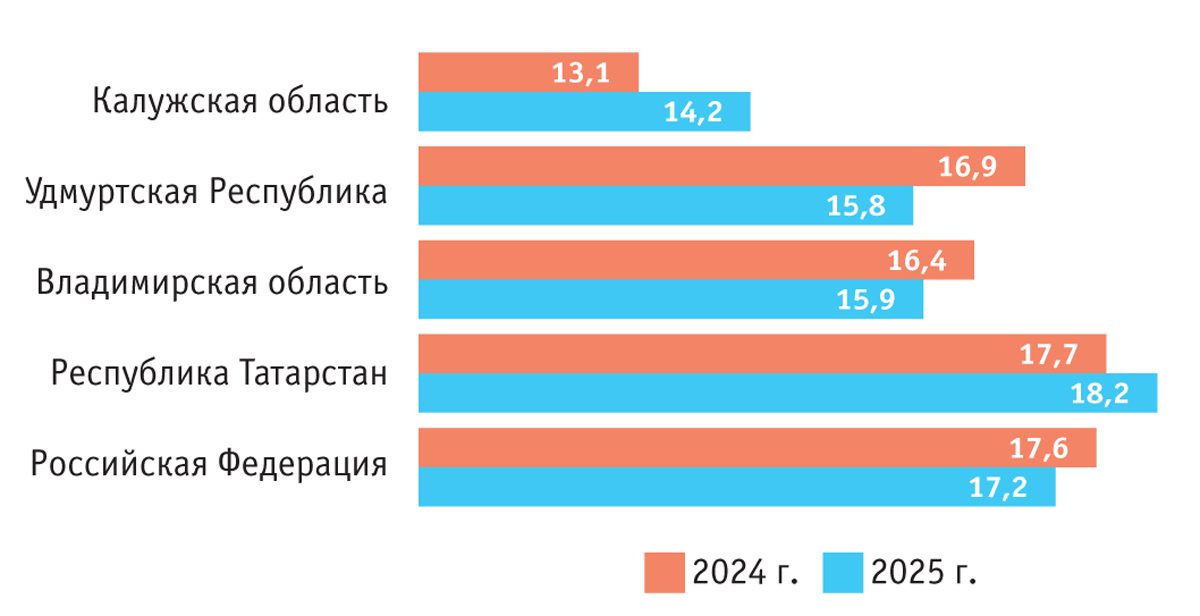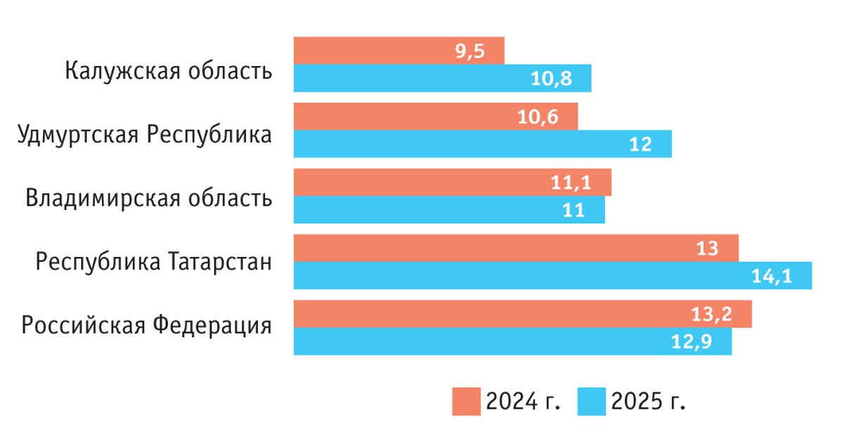 При сравнении данных за 2024 и 2025 гг. было установлено, что в среднем в России и Республике Татарстан в 2025 г. ситуация с уровнем сырой золы в кормах из люцерны не изменилась. Отмечено также, что в 2024 г. в Удмуртской Республике и во Владимирской области сельхозпроизводители провели мероприятия, способствовавшие уменьшению зольности сенажа, благодаря чему в 2025 г. по этому показателю наметилась положительная тенденция.