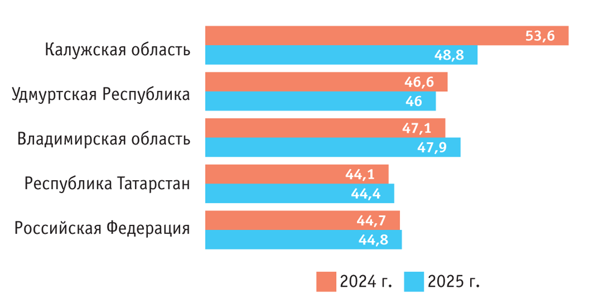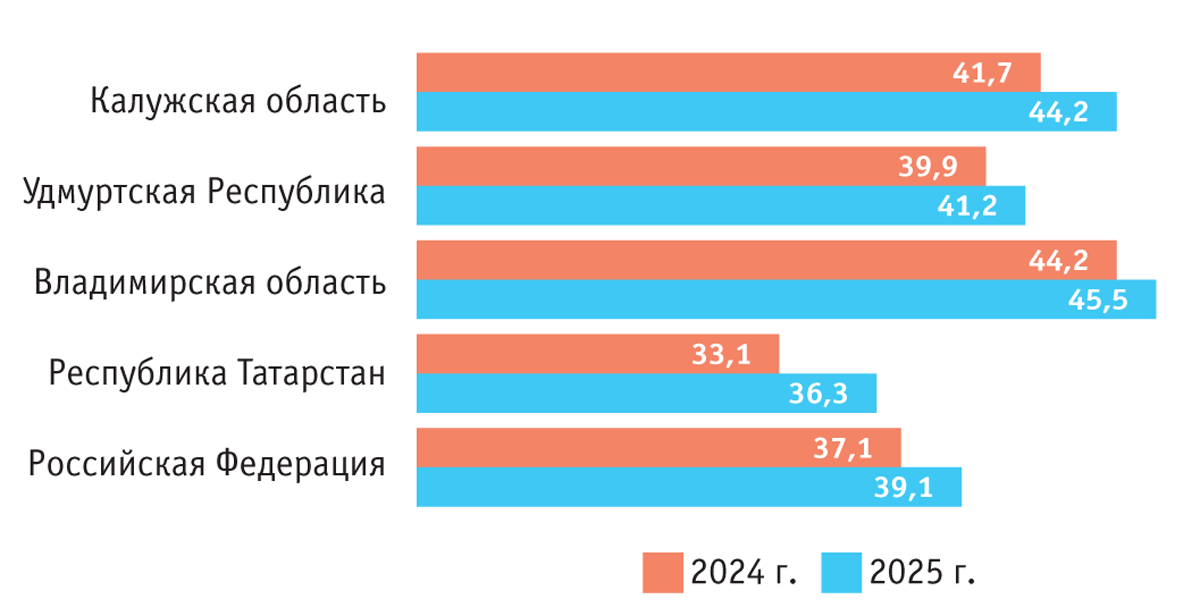Для наглядности было проведено сравнение данных, характеризующих содержание СВ в сенаже из люцерны, полученном в Калужской и во Владимирской областях, а также в Удмуртской Республике и Республике Татарстан, со средними значениями концентрации СВ в сенаже, заготовленном в хозяйствах РФ в 2024 и 2025 гг. (рис. 1).
