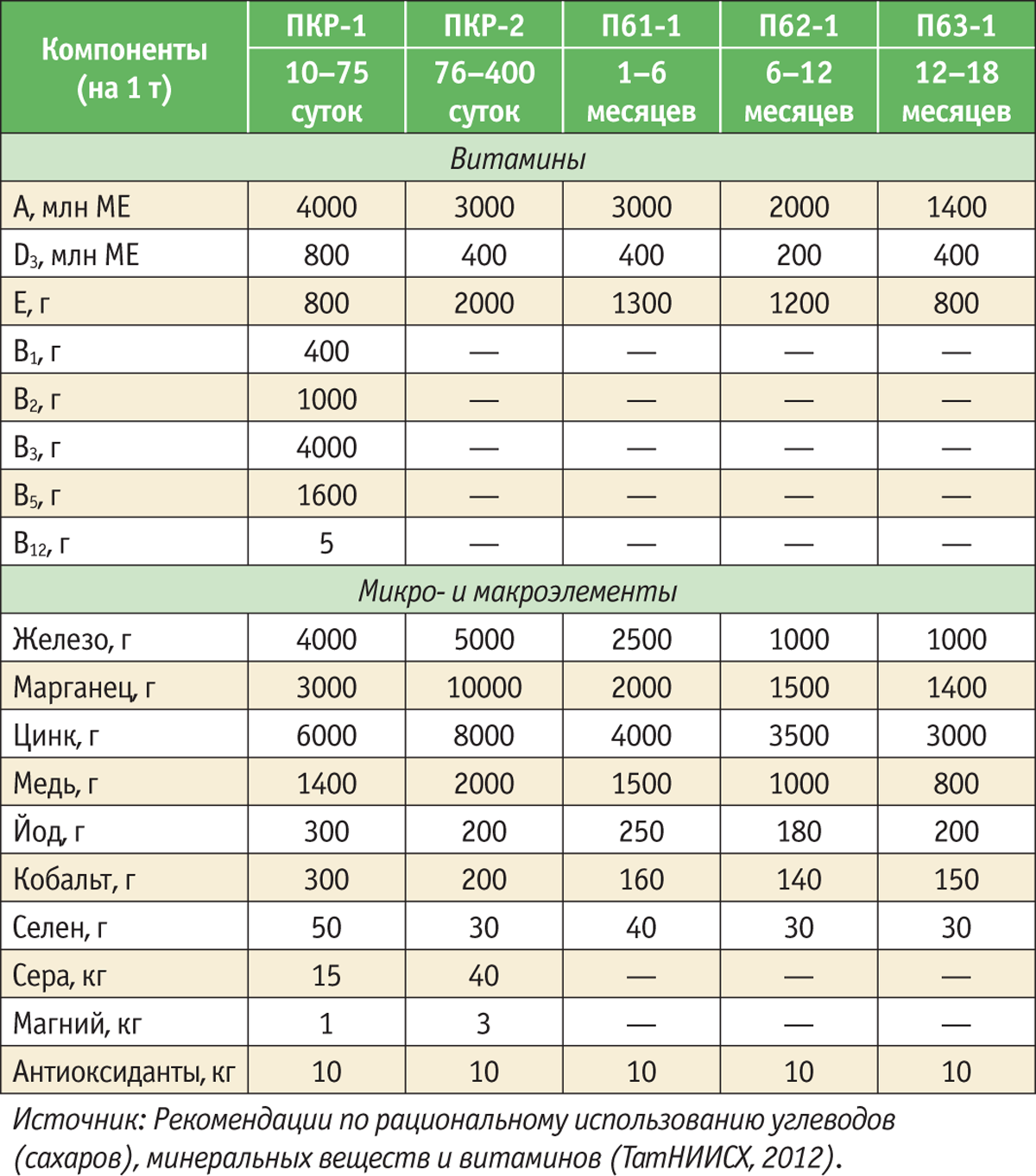 В молочный период телятам для роста требуются те же минеральные вещества, что и другим животным. Молоко и ЗЦМ обычно обеспечивают их минералами, необходимыми в первые недели жизни. Содержание этих компонентов в молозиве и молоке, особенно от коров с минеральным дефицитом, может быть низким. Стартеры, как правило, содержат достаточное количество макро- и микроэлементов. Учеными Ш.К. Шакировым, Н.Н. Хазиповым, Ф.С. Гибадуллиной и С.И. Чуриным разработаны нормы ввода витаминов и минеральных веществ в корма для телят (таблица).